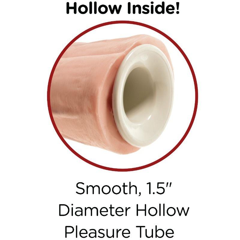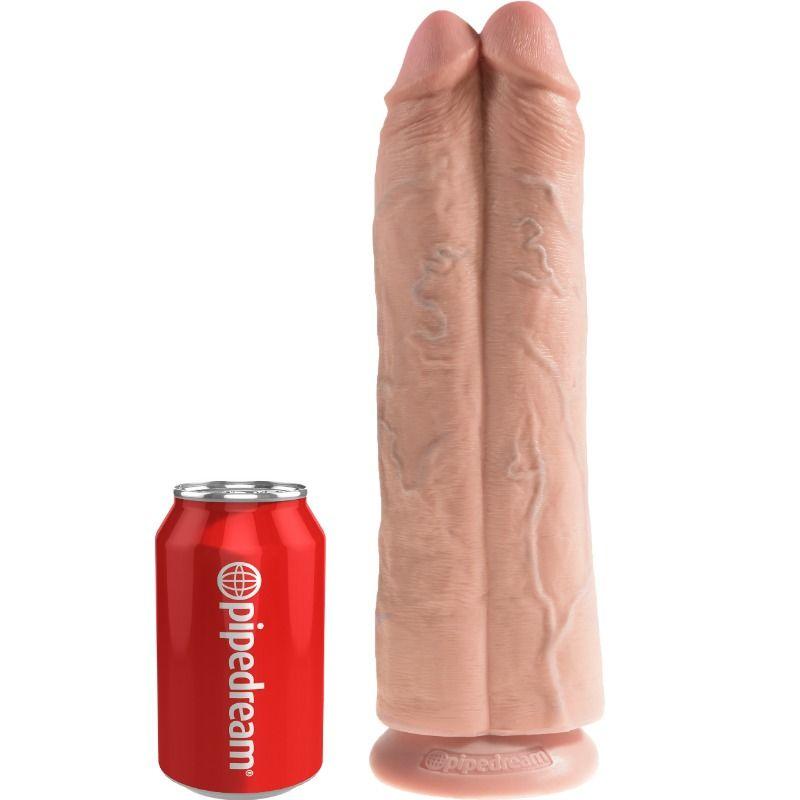 King Cock Two Cocks One Hole Ontto Strap-On Olkainjärjestelmä on ftalaatiton ja valmistettu Pipedreamin huippumodernilla tehtaalla Yhdysvalloissa. Pitkä, ontto muoviputki, jonka halkaisija on 3,8 cm, on sijoitettu kumisen dildon sisään, mikä tekee siitä täydellisen miehille, joilla on suorituskykyongelmia, mutta se on tarpeeksi tukeva kaiken sukupuolen käyttäjille.