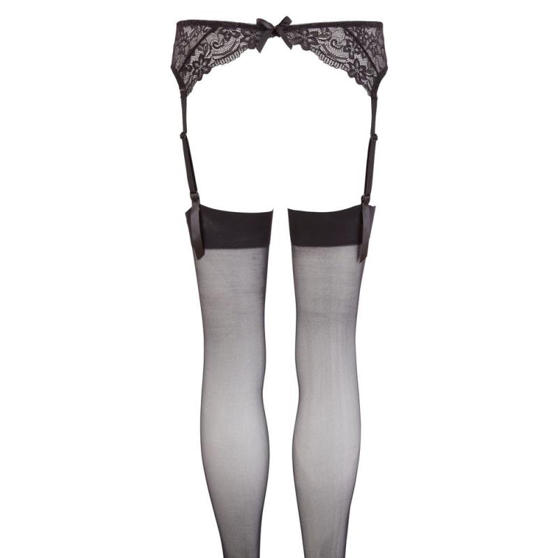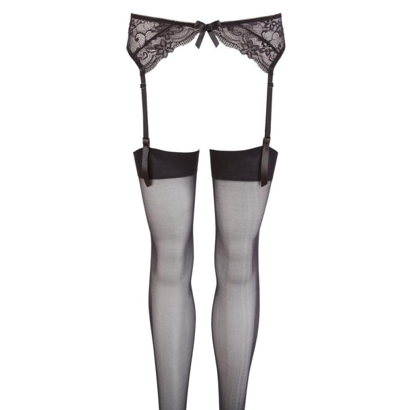 Täydellinen viettelysetti! Musta pitsinen sukkanauhavyö säädettävillä sukkanauhoilla. Yksinkertaiset mustat sukat sisältyvät. 100% polyamidia.
