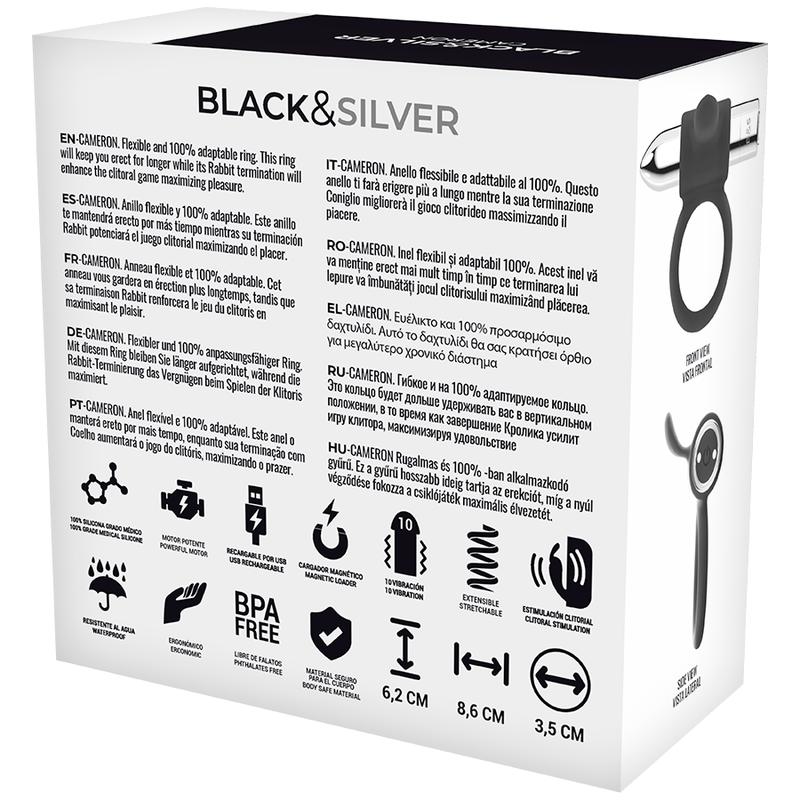 Tässä tulee erityisen makea lahja parhaalle ystävällesi! Tämä upea miesstimulaattori on naamioitu penisrenkaaksi ja haluaa makeuttaa sydämesi hetkiä. Black&Silver Ringin avulla voit parantaa nautintokeihääsi ja antaa itsellesi ja rakkaallesi kihelmöiviä ärsykkeitä. Silkkisen sileällä, syvänmustalla lääketieteellisestä silikonista valmistetulla pinnallaan Black&Silver vie sinut aistilliseen ekstaasiin heti, kun laitat sen päälle. Rengas venyy miellyttävästi ja mukautuu siksi kaikkiin kokoihin, vain mahtuakseen ja antaakseen nautintoa peniksellesi.