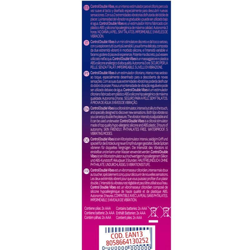 Kahden värisevän haaran ansiosta nautit kaksinkertaisesta nautinnosta. Vibraattorin intensiteetti on säädettävissä ja sitä voidaan käyttää veden alla. Control Double Vibes on intiimi stimulaattori, joka on valmistettu ABS-muovista ja korkealaatuisesta hypoallergeenisesta silikonista.
