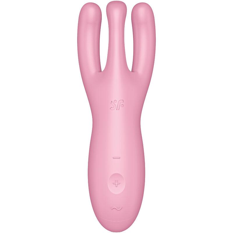 Satisfyer Threesome 4:ssä on kolme käsivartta, tehokas moottori ja innovatiivinen muotoilu. Se on kosketusvibraattori, joka stimuloi klitorista ja häpyhuulia.