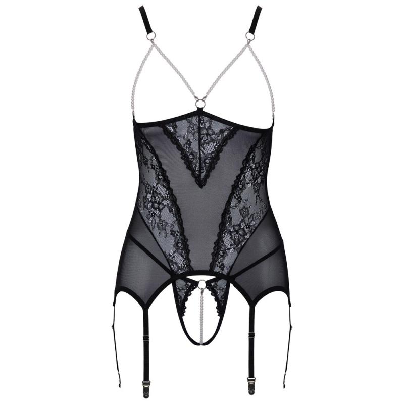 Avoin rintaliivimäinen toppi ja mustat, haarattomat stringit setissä Cottelli LINGERIE -mallistosta. Valmistettu herkän ohuesta powernet-materiaalista, jossa pitsiyksityiskohtia edessä. Pehmeä ja joustava joka puolelta, mikä takaa korkean käyttömukavuuden. Valkoiset helmiketjut kehystävät viettelevästi paljasta rintaa ja ne on kiinnitetty koristeellisiin renkaisiin pikakiinnikkeillä. Olkaimet ovat säädettävissä avoimessa selässä. Topin takana on hakaskiinnitys. Kuusi sukkanauhaa ovat säädettävissä pituudeltaan. Yhteensopivissa stringeissä on haaraton pitsietuosa ja irrotettava stimuloiva ketju haarassa.