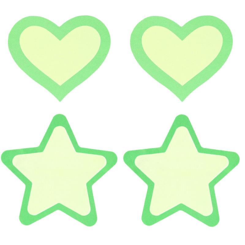 2 paria ensiluokkaisia itsekiinnittyviä nännitarrat. Yksi sydänpari ja yksi tähtipari hohtavat pimeässä.
