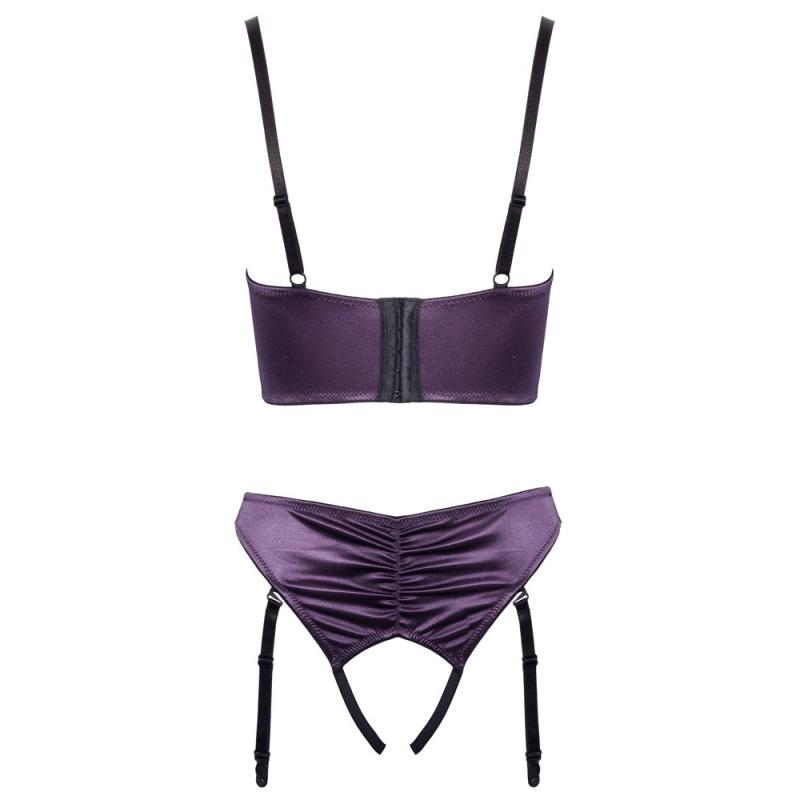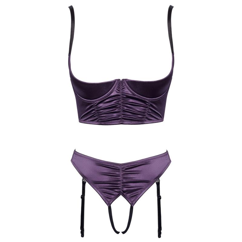 Quarter cup -rintaliivit ja haaraton sukkanauha-alushousu setissä Cottelli LINGERIE -mallistosta. Valmistettu tummanvioletista joustavasta satiinista, jossa on tyylikkäät rypytetyt yksityiskohdat ja mustia yksityiskohtia. Pidemmän mallinen, kaarituettu rintaliivi kevyesti topatuilla kupeilla korostaa rintoja ja luo vastustamattoman katseenvangitsijan. Olkaimet ja takana oleva hakaskiinnitys ovat säädettävissä istuvuuden takaamiseksi. Sukkanauha-alushousu viettelee täysin avoimella haaralla. Sukkanauhat ovat säädettävissä ja ne voi myös irrottaa kokonaan.