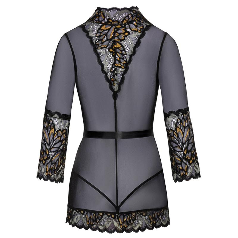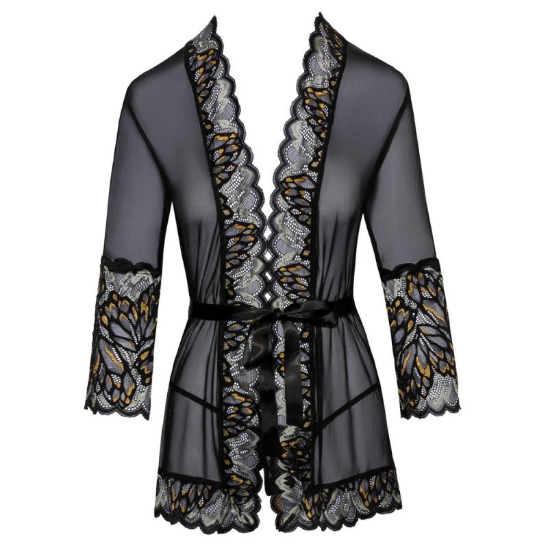 Kissable-merkin lyhyt kimono, joka peittää pepun ja on valmistettu herkän ohuesta powernet-kankaasta sekä elegantista pitsistä. Materiaali on pehmeää ja joustavaa, mikä takaa miellyttävän istuvuuden. Kimonossa on 3/4-pituiset hihat ja satiinivyö, jonka voi solmia.