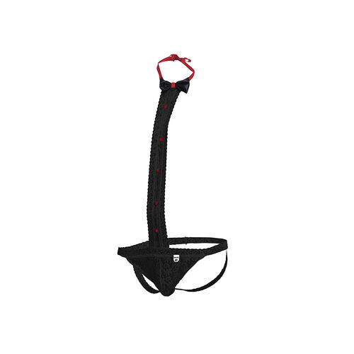 Täydellisen tuhman ja samalla vaikuttavan pomon lookin saat tällä asulla. Mitä muuta voisit toivoa? Tämä setti vie sinut heti rooliin, kun puet sen yllesi. Erittäin tyylikäs ja vertaansa vailla oleva design, joka tekee sinusta taatusti huomion keskipisteen. Täydellinen lavashow'hin, roolileikkeihin tai tuhmien hetkien piristykseksi tuomaan lisää maustetta ja hauskuutta. Yllätä kumppanisi tällä upealla miesten asulla ja lisää hauskuutta vaatekaappiisi klassisilla smokki-pitsistringeillä, joissa takana jock strap -yksityiskohta ? minimipeitto, maksimaalinen paljastavuus. Helppo tapa esitellä muotoillut ja kohotetut pakarat.