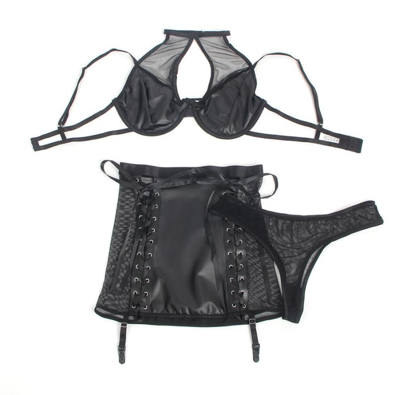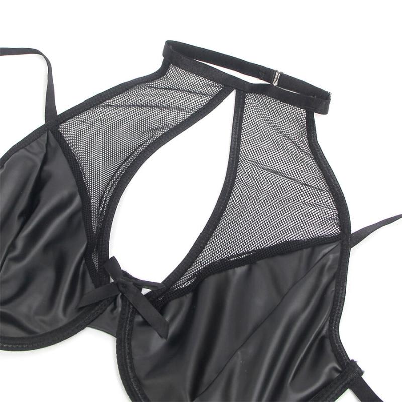 Tämä PU-nahasta ja läpikuultavasta meshistä valmistettu alusvaatesetti luo täydellisen tasapainon provokaation ja eleganssin välille. Halterneck-malli korostaa hartioita ja kaula-aukkoa näyttävästi, kun taas vinyylimateriaali antaa asulle ripauksen kapinaa ja voimaa. Mesh-yksityiskohdat tuovat strategisia läpikuultavia kohtia, jotka paljastavat ihoa viettelevästi, yhdistäen rohkeuden ja hienostuneisuuden.