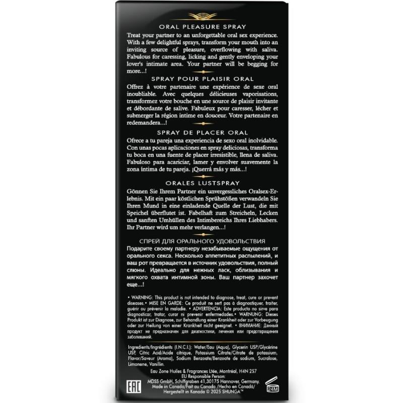 Discover a new way to enjoy oral sex with this spray designed to elevate the experience to another level. With just a few sprays, your mouth acquires a softer, wetter texture, perfect for sensually exploring every intimate corner of your partner. Its delicious flavors awaken the senses and transform every kiss, every lick, and every touch into an irresistible stimulus that naturally increases desire.