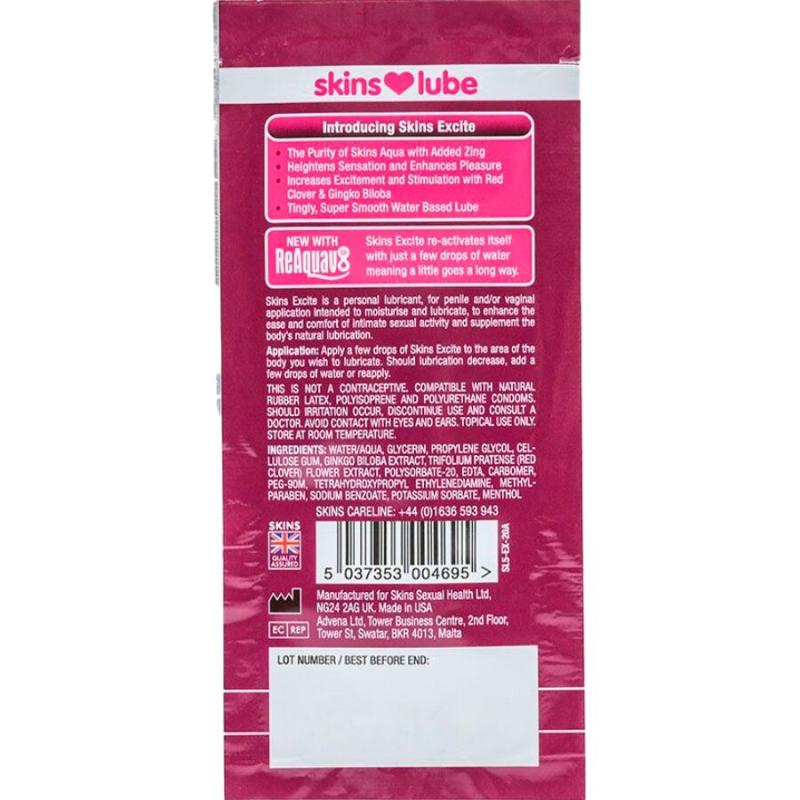 Skins Excite tarjoaa kaiken Skins Aqua -liukuvoiteen hauskuuden ja hyödyt, mutta lisättynä ylimääräisellä nautinnolla. L-arginiinin ansiosta se lisää verenkiertoa levityskohdassa. Tämä voimistaa tuntemuksia naisilla ja antaa miehille jämäkämmän erektion. Täynnä luonnollisia ainesosia, jotka saavat erogeeniset alueesi kihelmöimään. Otimme Skins Aqua -kaavan ja lisäsimme siihen puna-apilan ja ginkgo biloban afrodisisia ominaisuuksia. Tuloksena on liukuvoide, joka tarjoaa vastustamattoman kihelmöivän tunteen, lisää kiihottumista ja vie nautinnon uusiin ulottuvuuksiin. Intohimo ja nautinto täydellisessä harmoniassa!