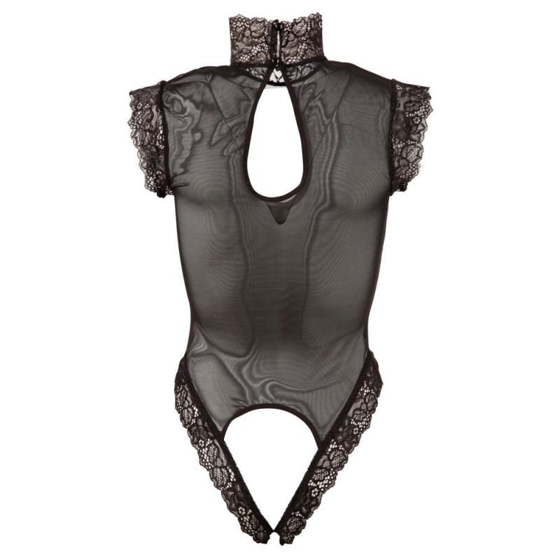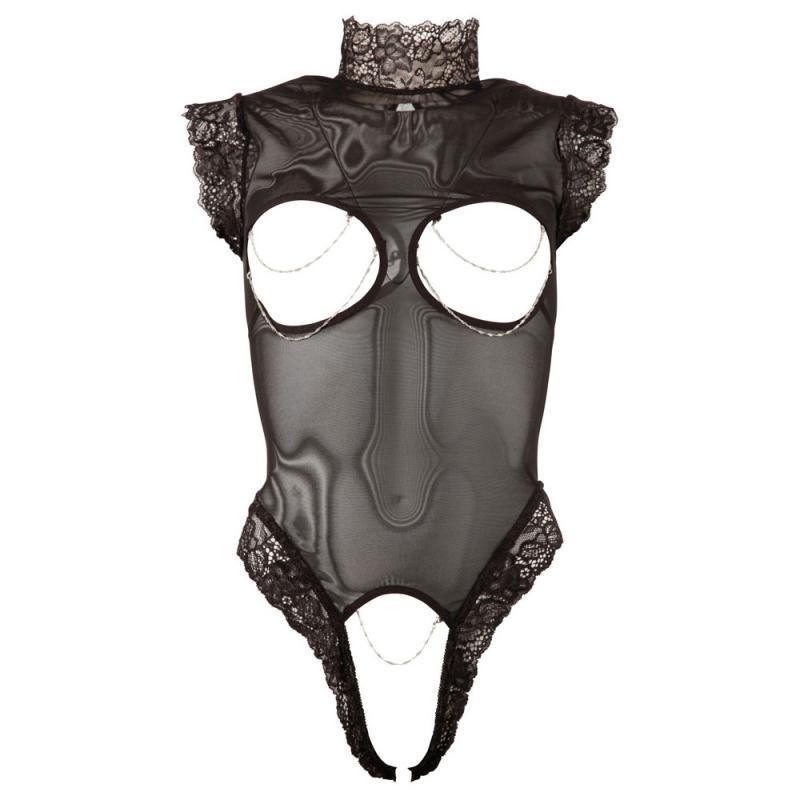 Cottelli Cupless ja Crotchless läpinäkyvä Body pitsireunuksilla käsivarsissa ja kauluksessa. 2 nappia takana ja lahkeensuissa. Rinnat ja haara ovat koristeltu ja avoinna irrotettavalla ketjulla.